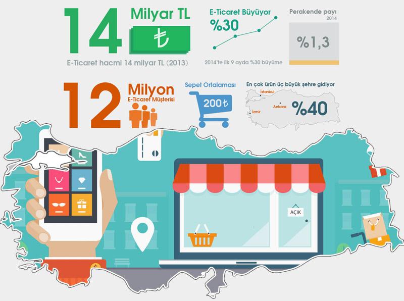 2014 yılı ilk altı ayında ortalama %9,7 seviyesinde olan alışveriş toplam kredi kartı kullanımı içinde e-ticaretin payı, 2015 yılı ilk 6 ayında ortalama %11,1 seviyesine ulaşmıştır. 2014 yılı e-ticaret hacmi 41,9 milyar TL olarak belirlenmiştir. E-ticarete pazar payı yükseliyor. 2015 yılının ilk 6 ayı içerisinde %30 büyüme gösteren e-ticaret payı, yılın kalan bölümünde de aynı ivme ile artarsa, 2015 yılı sonunda 54,4 milyar TL seviyesine ulaşaceğı düşünülmektedir..